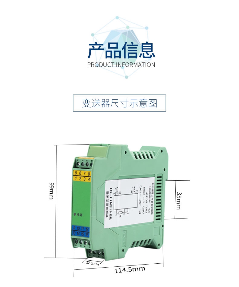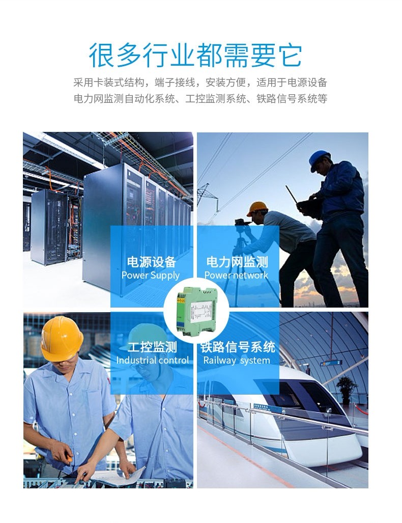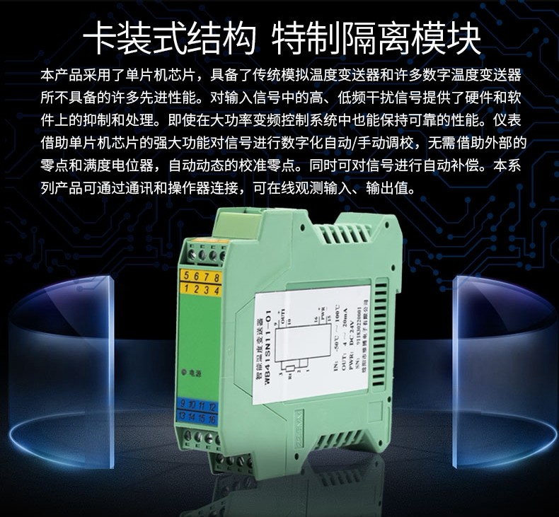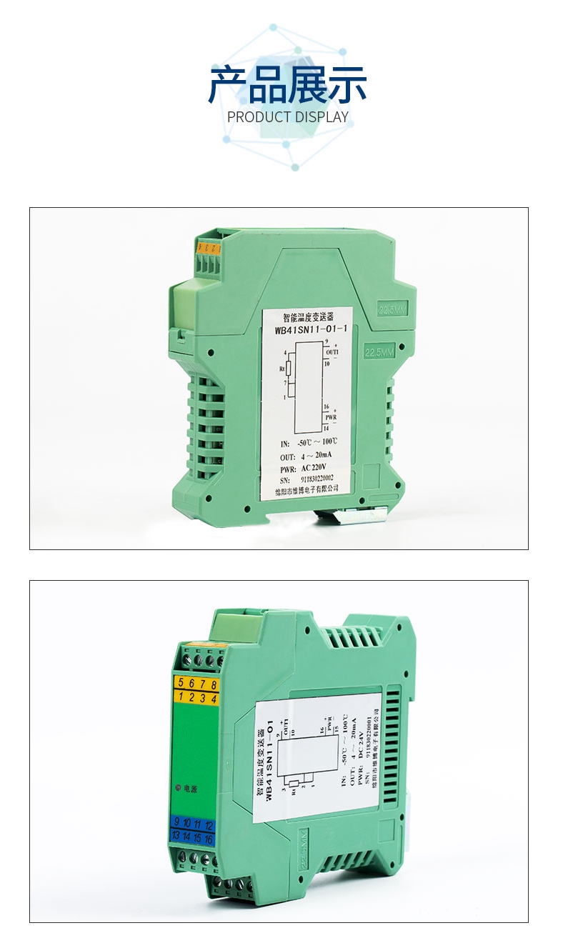 本產(chǎn)品采用單片機(jī)芯片,因此,產(chǎn)品具有極大的通用性和易用性,可取代各類傳統(tǒng)的溫度變送儀表。輸入輸出信號(hào)的種類熱電阻(Pt100、Cu50),熱電偶(K、E、S、J、R、N、B)及通道模式(一入一出,一入兩出)均可通過(guò)SN1001手操器進(jìn)行設(shè)定,這極大的增強(qiáng)了產(chǎn)品的通用性。在輸入、輸出和電源之間提供了電氣隔離。系列可與單元組合儀表及DCS、PLC等系統(tǒng)配套使用,在油田、石化、電力、制造、冶金等行業(yè)提供廣泛應(yīng)用。